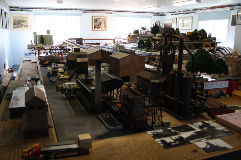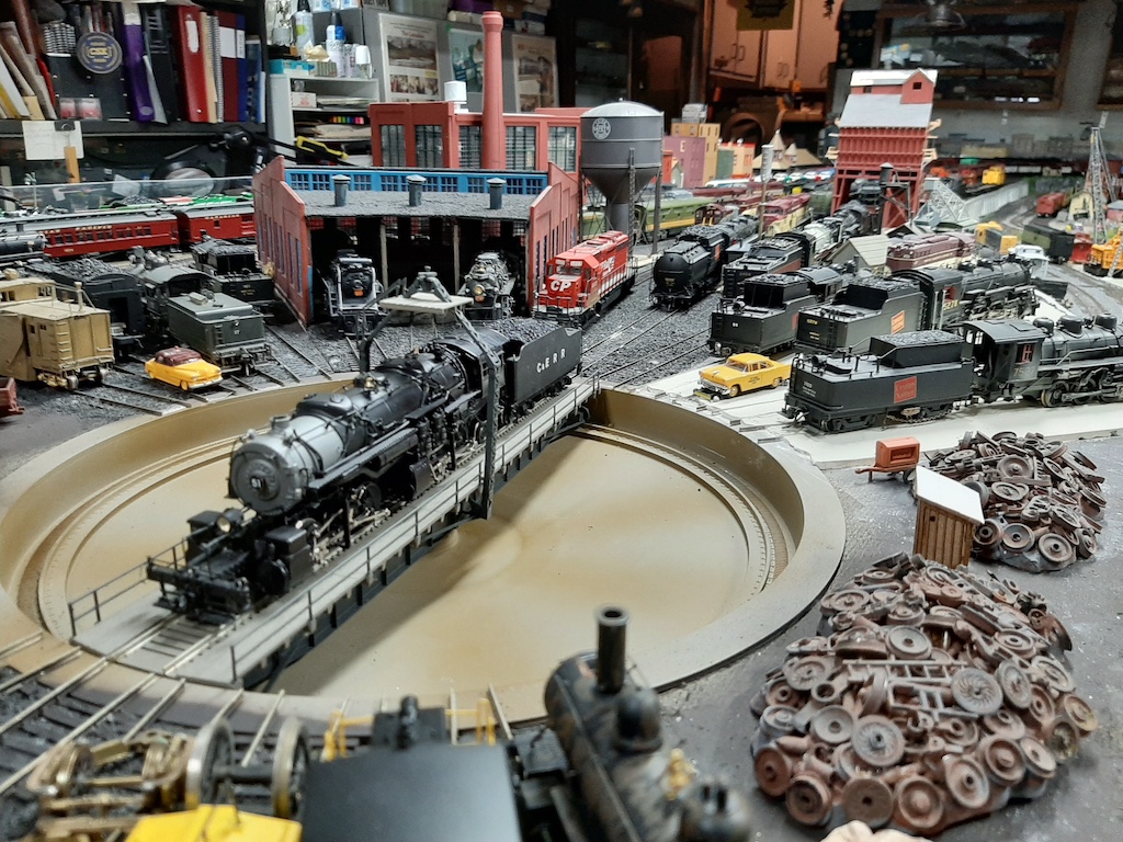 Barry Kelly calls his HO railroad (Hamilton)the Plywood Central. It’s a brightly lit, 20’ x 30’ upstairs room with lots of long trains running (at least 7 independently at once, on several levels), lots of structures, including a new steel mill, and – yes – a certain amount of plywood