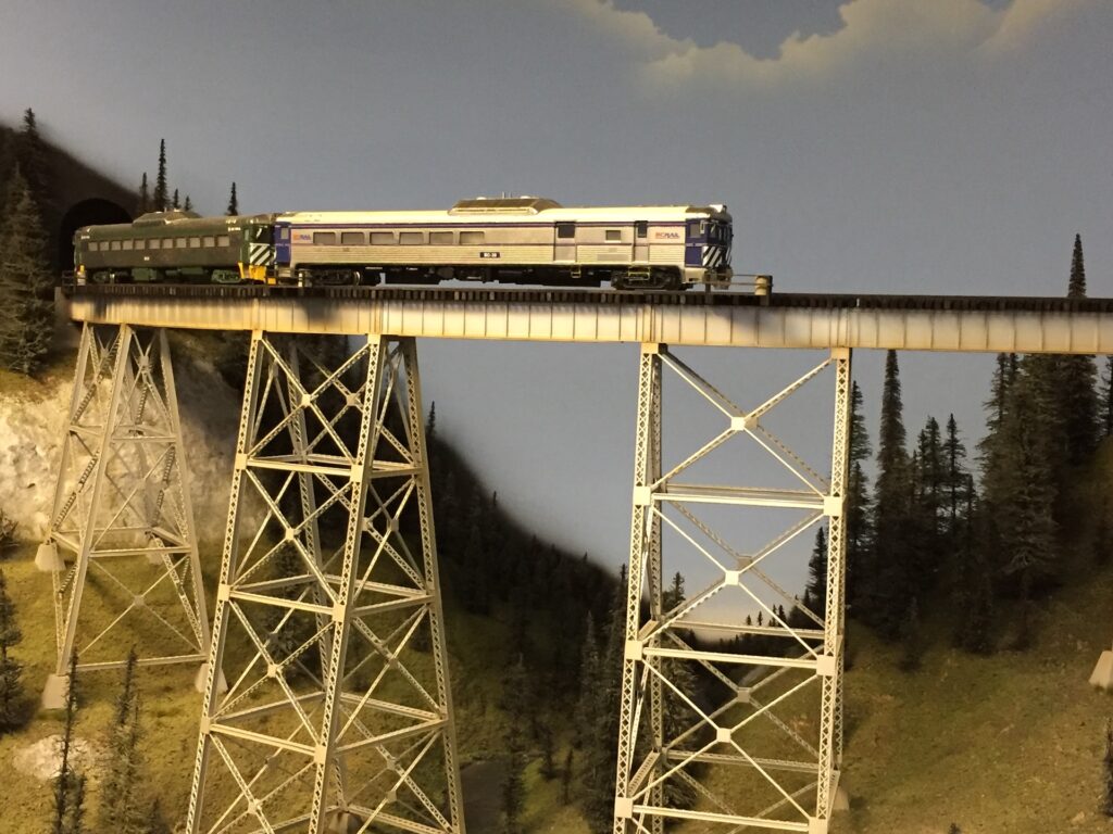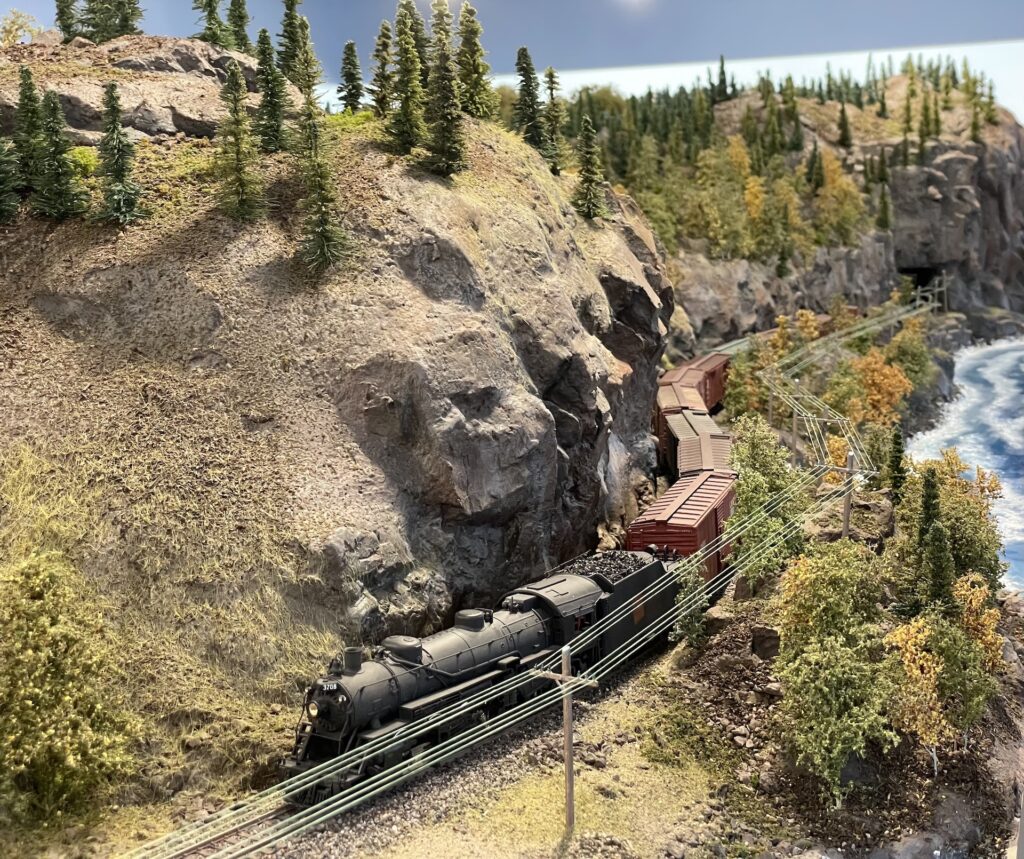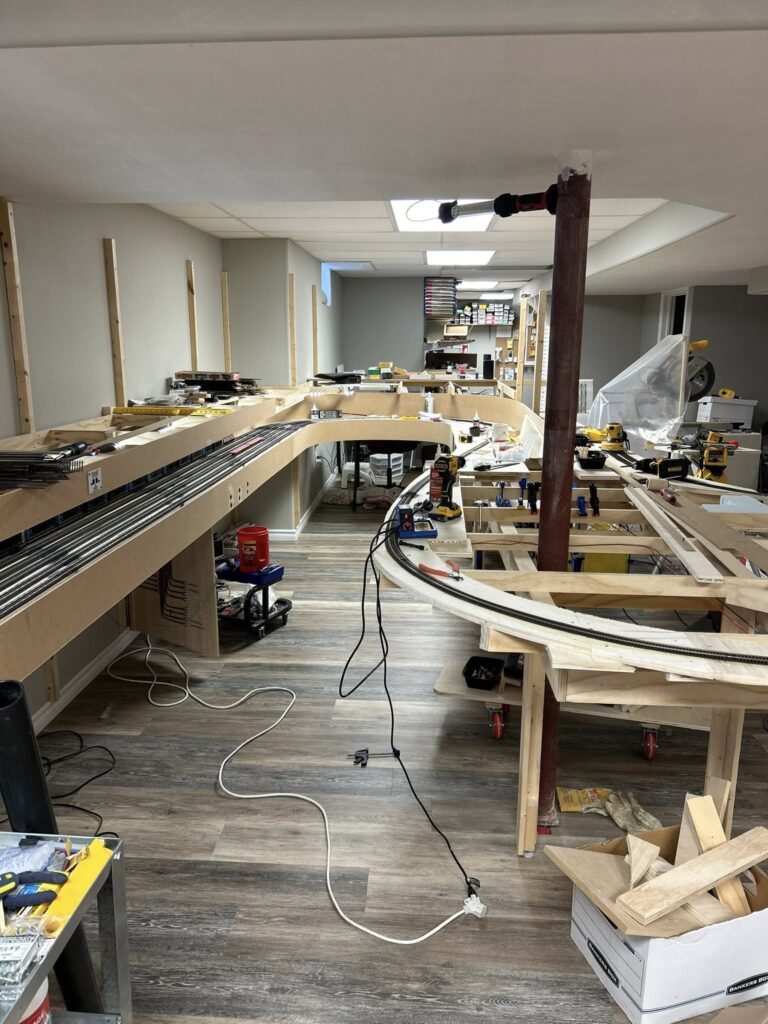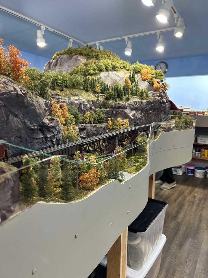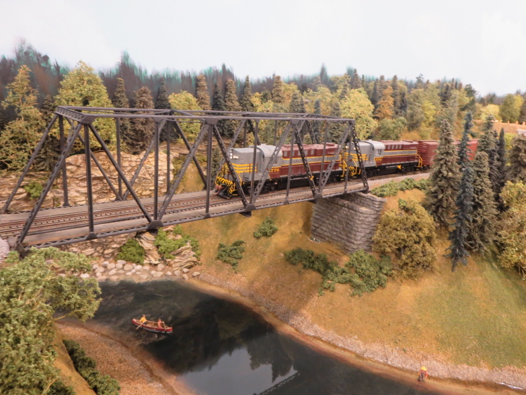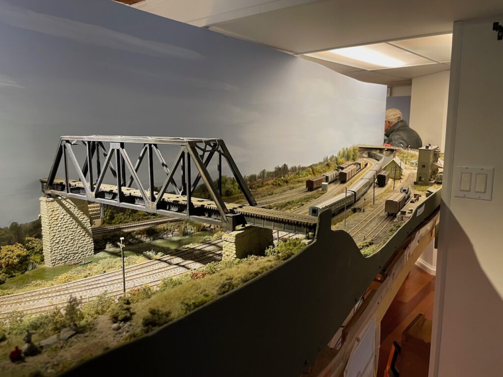 Mike Scott’s new HO scale layout is a 42’ x 25’ railfan’s delight: Long trains on long runs through lovely scenery. Two full sets of Rapido’s “The Canadian” operate on the layout along with a total of 20 locomotives and 200 pieces of rolling stock. It takes about 10 minutes for a train to complete a circuit of the 245’ mainline.!