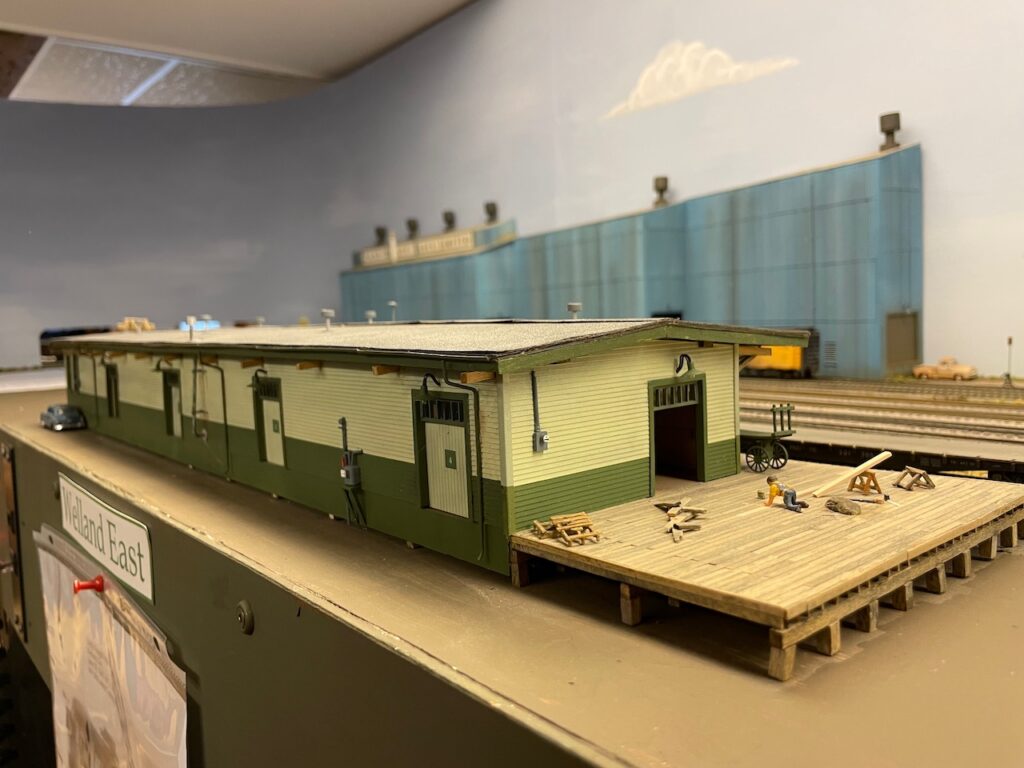Jim & Barbara Tucker (Wainfleet) built their 35′ x 18′ HO layout its own building, replicating an 1890s freight shed from the Lehigh Valley Railroad. 200’ mainline and 40’ branch, operational signalling system, hidden staging with reversing loop, switchback to coal mining from hidden coal yard, several trestle bridges (one almost four feet), freight and engine yards, natural scenery blocks and day/night lighting with timed lighting periods in the scenery.